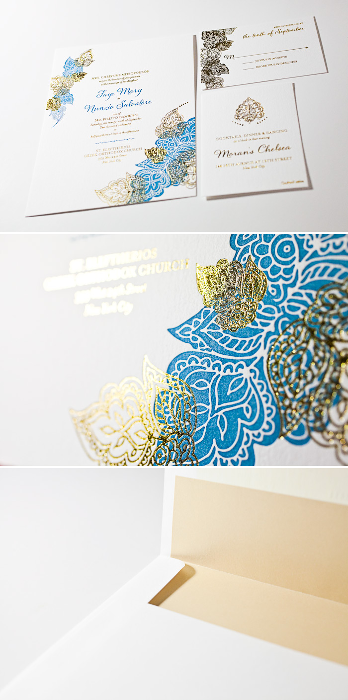 It would be an understatement to say that the pairing of mediterranean letterpress ink and gold shine foil makes for gorgeous wedding invitations. This customization of our Divya Formal design (by Racheal Decker) was sent to us by our friends at Judy Paulen Designs in New York. Metallic gold dust envelope liners completed the look of this stunning invitation set.