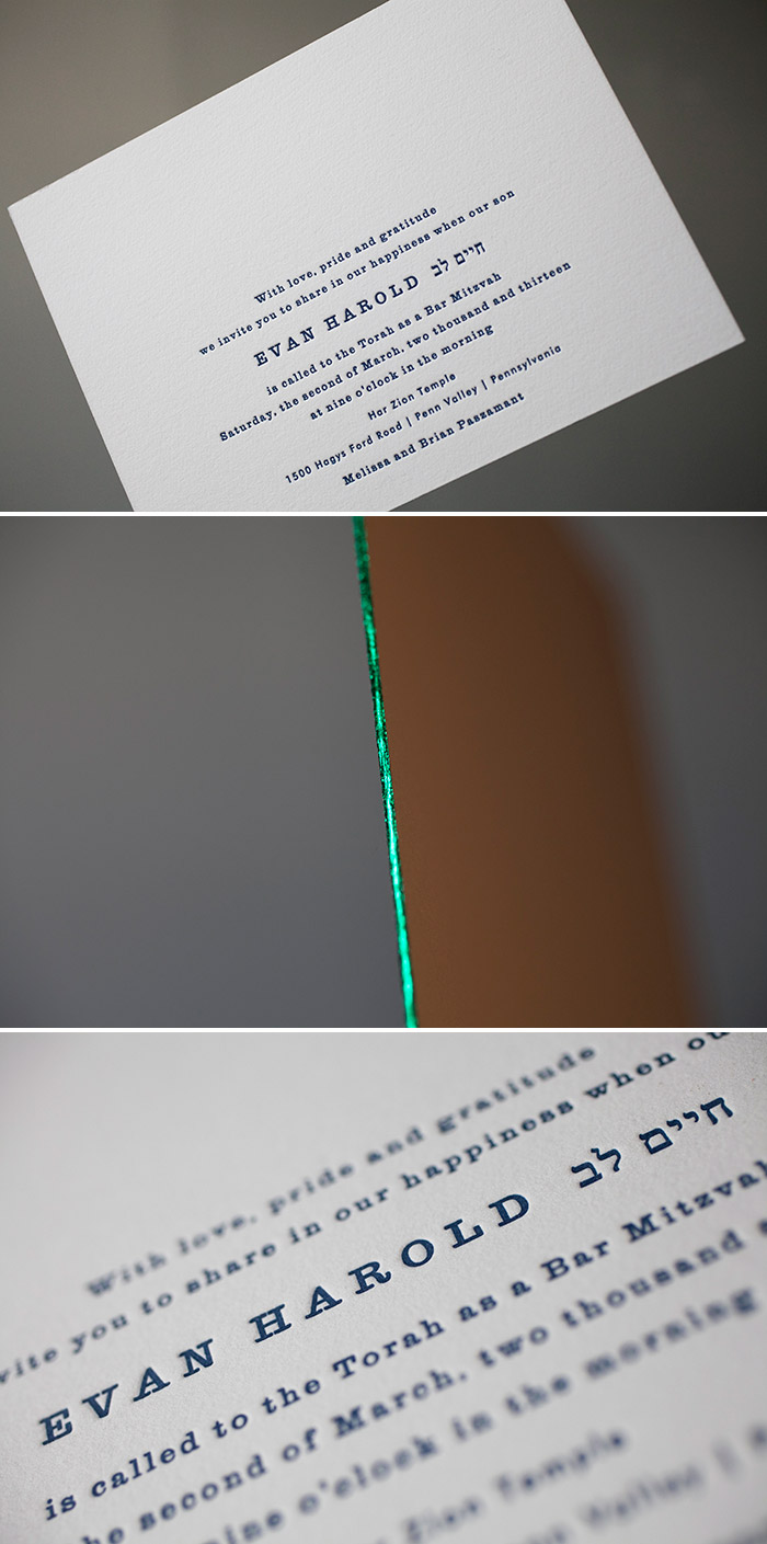 letterpress inks: yolk + pewter | fonts: futura + meadow | paper: bella cotton white 1-ply + 2-ply | edge painting: pewter | envelope: bella cotton white | liner: classic chevron pattern in yolk | customization #: 17420 | Mark Harris Stationers