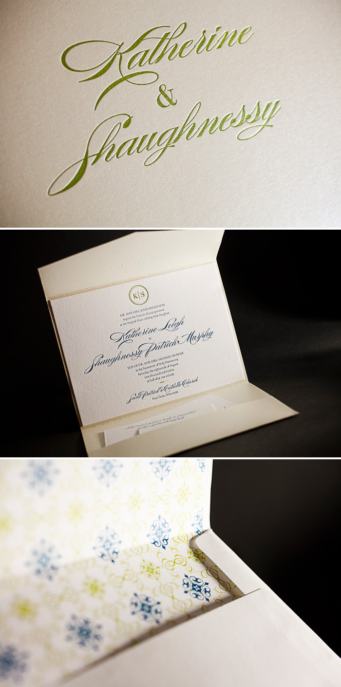 inks: mediterranean + chartreuse | fonts: danube + amalfi | paper: 1-ply white | invite size: f8 | liner: the classic color pattern in mediterranean + chartreuse | pocketfold: opal
